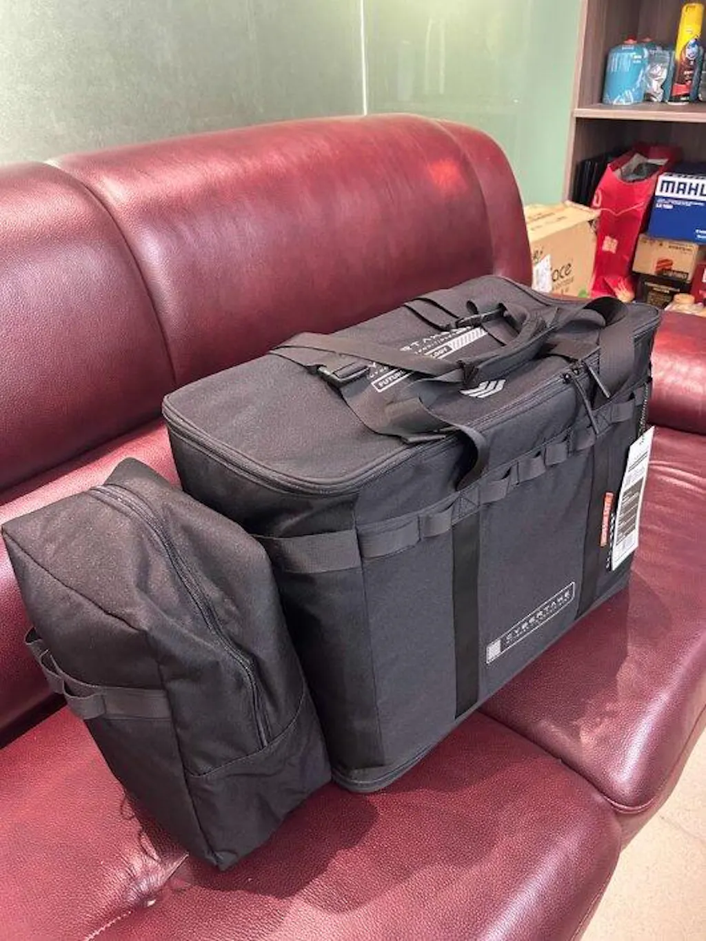 - The main bag holds the air conditioner main unit, while the Auxiliary Pocket stores the Front Outlet Adapter and Rear Inlet/Outlet Adapter.